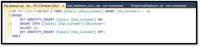 I faced a small problem when I tried to deploy one of my database projects yesterday. The script.PostDepooyment was not executed at the end of my database deployment script. This script is very useful for me since I use it to fill some tables with idempotent static data. Static data for me is unknown dimensions members that have their surrogate keys smaller than 0 (-1, -2, etc.). By idempotent I mean that my insert scripts do not blindly try to insert data into tables, they check whether the row exists before inserting it: