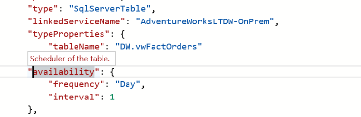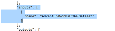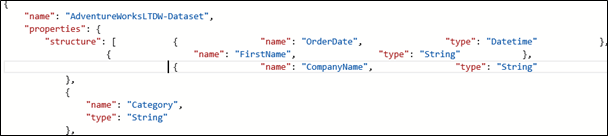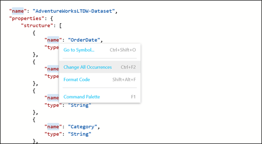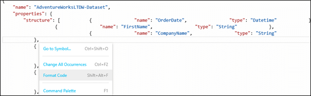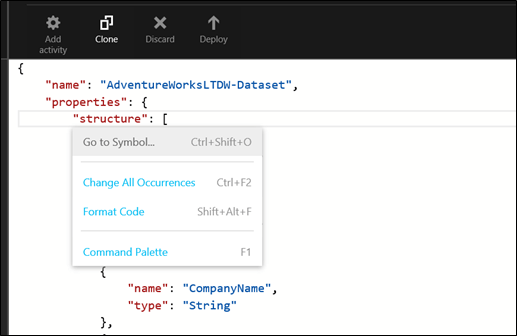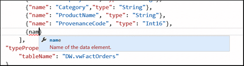 Now, let’s see how we can use intelliSence in ADF. Like any .Net language, intellisense can be triggered by typing CTRL+Spacebar. For example, when we type structures in datasets using the ADF editor, we simply have to type: na without completing the word to “name”. Press on TAB and voila, itelliSense corrects the tag for us.
