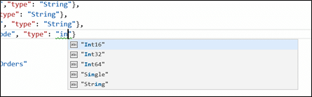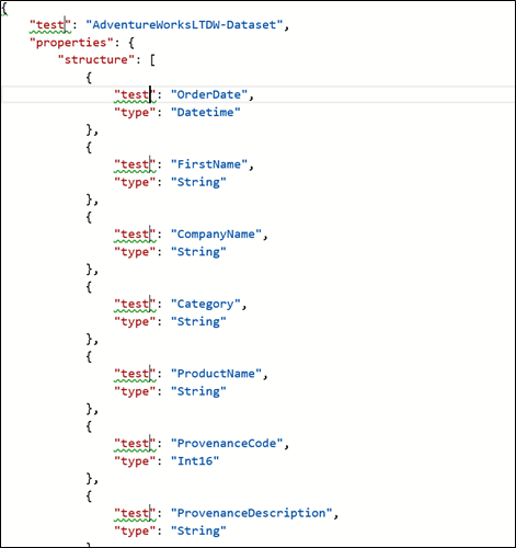 The editor also validates as we are typing. For example, we need to have a type in a structure of a dataset. Failure to provide one will lead to error when we’ll try to publish the dataset. In the image below, I highlighted the uncompleted structure element.