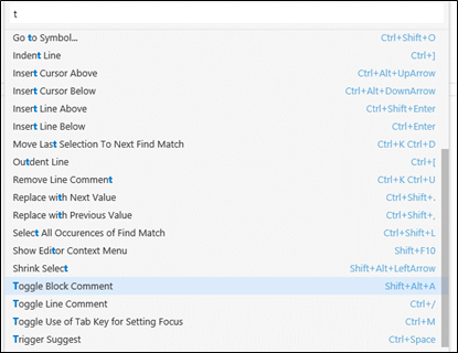 As you can see, there’s a textbox at the top that allows you to search for specific command. I typed the letter t and all commands that contained that letter are now displayed.