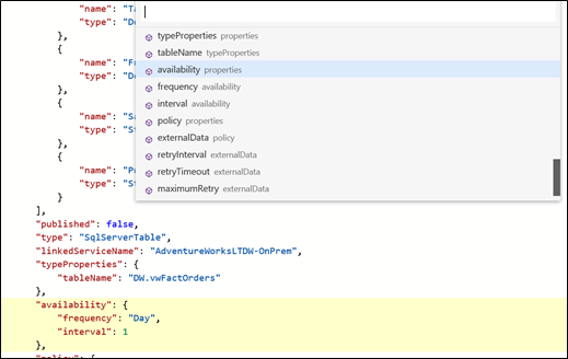 Azure Data Factory editor has gone a long way since i’s introduction at the end of February. There are remaining caveats like the fact that intelliSense won’t list user created objects in various artifacts. For example, in a pipeline, it would be nice that the input or output of an activity: