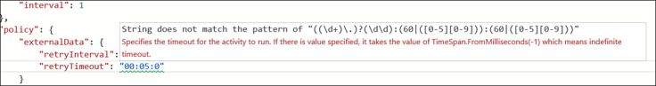 Another example is when external policies are used in the dataset. If one of the policies is not correctly provided, ADF editor will show a warning (green underline) where there’s missing or non-conform data.